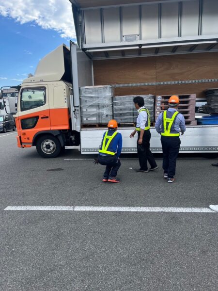 今回は、ドライバーさんにフォ-クリフトでトラックに積込を行って貰って荷物の養生を